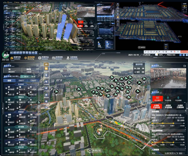 2021年利用数字孪生技术把杉板桥社区中的事件、位置、时间、人物、视频等信息关联起来,形成了可查、可看、可选、可分析、可调度的"社区数字孪生"。