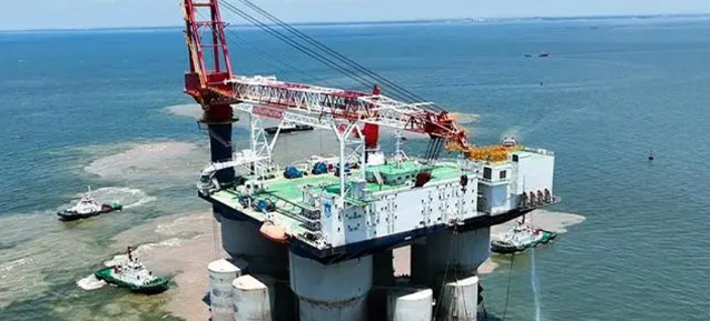 该项目船长175.1米,甲板面积超过7000平方米,可供135人同时在海上作业居住,主吊起重能力超过3000吨,拥有4条三角桁架桩腿。
