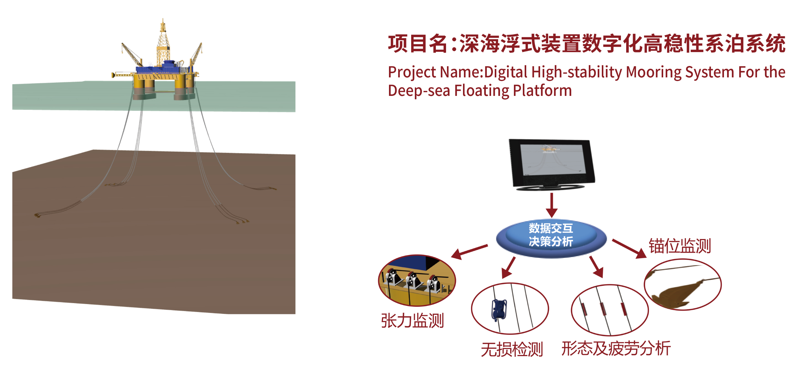 通过传感器及物联网对海锚入土过程、位置、系泊缆张紧力、疲劳腐蚀、磨损值等进行检测分析,可以达到实时监测。