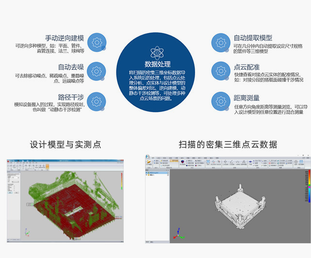 DACS-PointCloud点云测量与逆向建模软件能够处理GB数量级的三维点云数据,运行速度快、精度高、操作方便,是一套专业点云处理分析、逆向建模软件,将扫描的密集三维点云数据导入此系统后,对点云数据进行处理,可实现一键进行点实体与设计模型的整体偏差对比、以及逆向建模、动静态干涉检测等功能,并处理多种点云场景的问题。