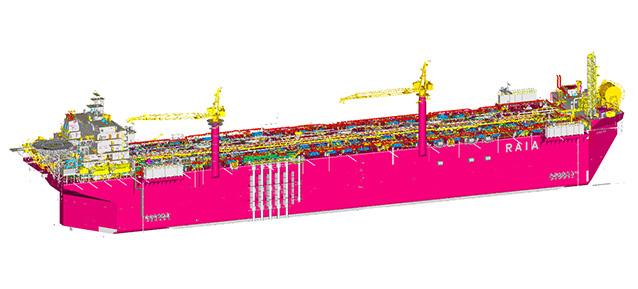 P-82 FPSO是巴西国家石油公司委托胜科海事建造的一艘大型浮式生产储油船,总长360米,型宽60米,型深34.3米,设计储油量为160万桶,日产能为22.5万桶石油以及1200万立方米天然气,具有先进的技术特点和较高的产能水平。海仓科技负责该项目中部区域设计。